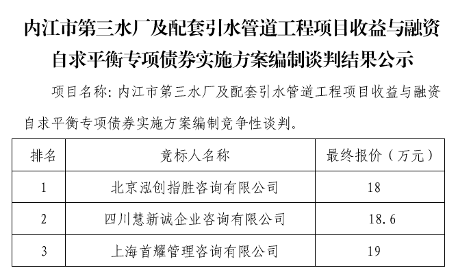 內江市第三水廠及配套引水管道工程項目收益與融資自求平衡專項債券實施方案編制談判結果公示