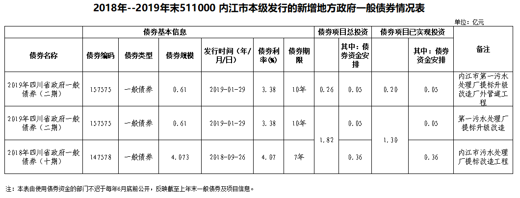 2018年--2019年末511000 內江市本級發行的新增地方政府一般債券情況表