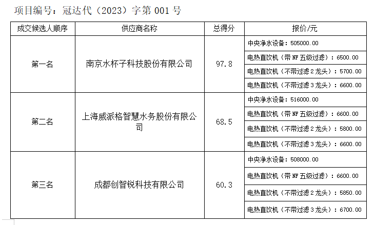 內江市水務有限責任公司內江高級技工學校管道直飲水成套設備及附件采購(含安裝)項目競爭性磋商結果公示