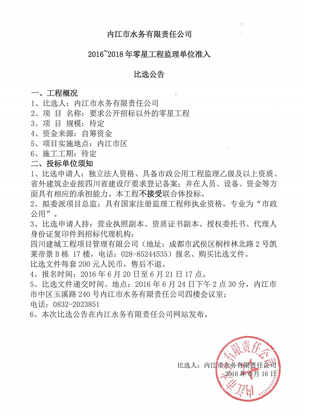 內(nèi)江市水務(wù)有限責(zé)任公司2016~2018年零星工程監(jiān)理單位準入比選公告