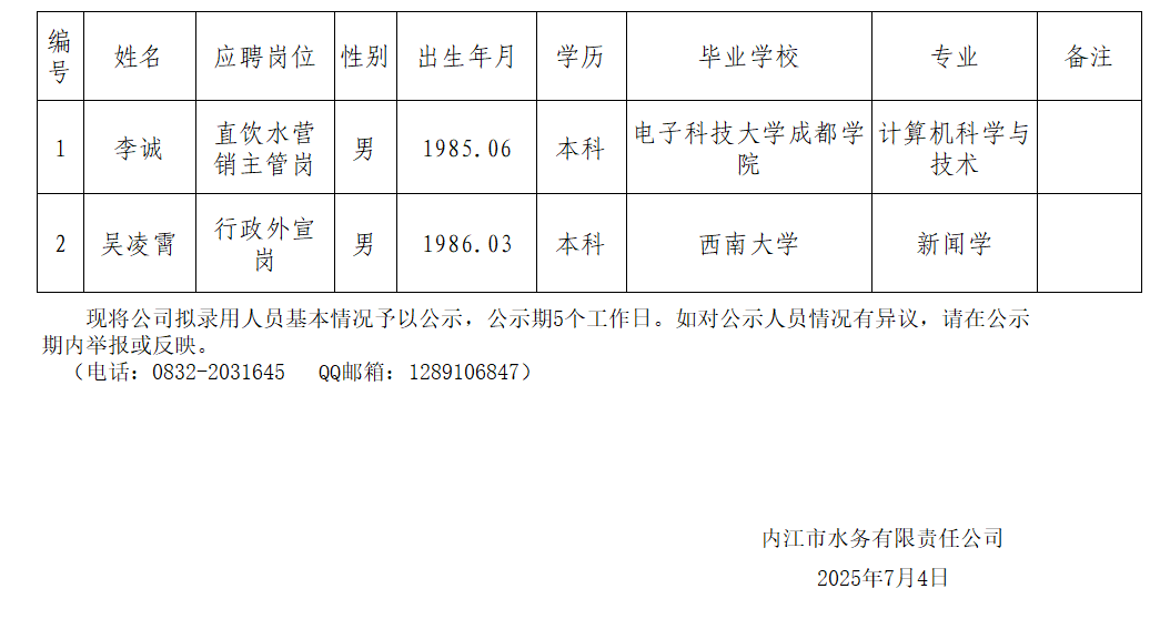 內(nèi)江市水務有限責任公司2025年7月擬招聘人員公示情況表