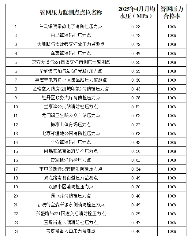 內江市水務有限責任公司2025年4月管網壓力月報