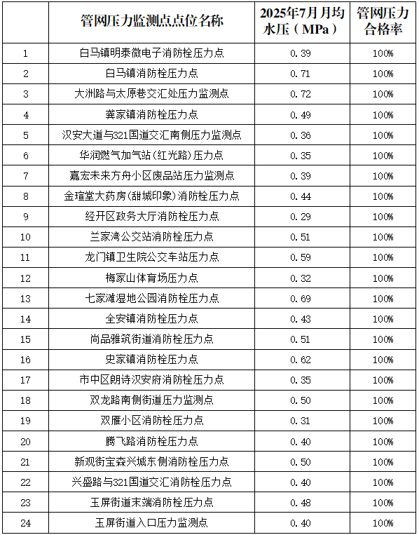 內江市水務有限責任公司2025年7月管網壓力月報
