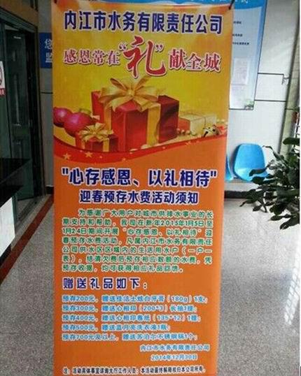 為感謝廣大用戶對城市供排水事業的長期支持和幫助,我司在2015年1月5日至1月24日期間開展“心存感恩、以禮相待”迎春預存水費活動。本次活動由客戶服務部牽頭,在白馬辦事處、物資供應部和機關各部門的支持配合下,圓滿結束。