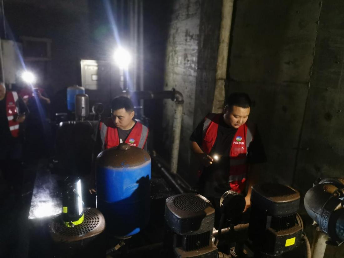7月15日,內江市水務有限責任公司(以下簡稱市水務公司)子公司豪鵬二次供水服務有限責任公司(以下簡稱豪鵬公司)接到該小區物業求助后,立即組織二次供水技術人員前往現場查看受災情況。技術人員在對二次供水設施受損情況進行評估后,向物業公司及社區管理人員提出二次供水設施維修指導意見,并幫助小區物業制定應急供水搶險及設備搶修方案,確保第一時間恢復居民供水。同時,豪鵬公司立即聯動市水務公司客戶服務部,在受災小區內設置了臨時取水點,以緩解居民用水困難。