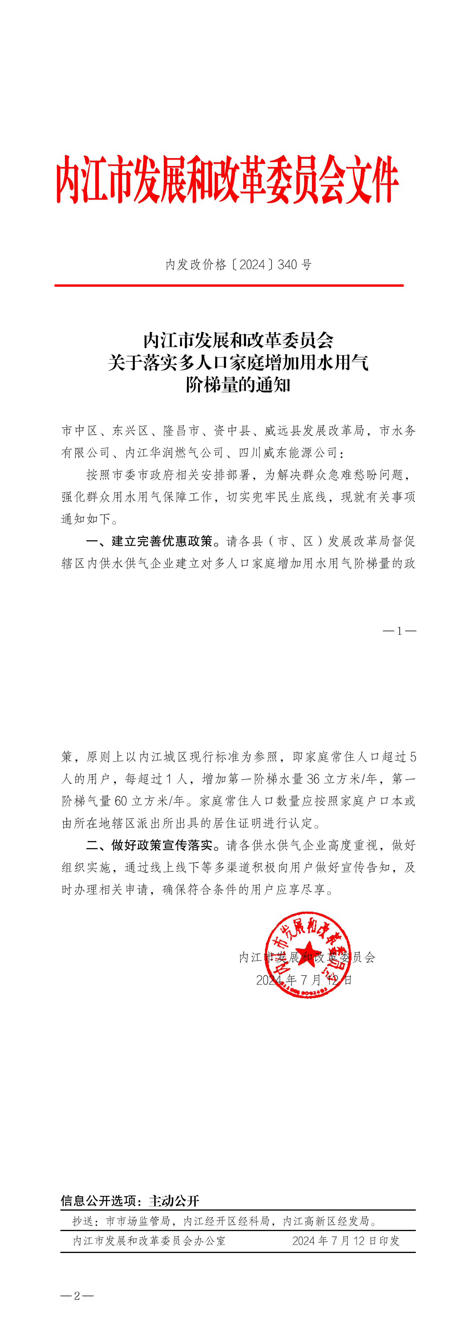 內江市發(fā)展和改革委員會關于落實多人口家庭增加用水用氣階梯量的通知